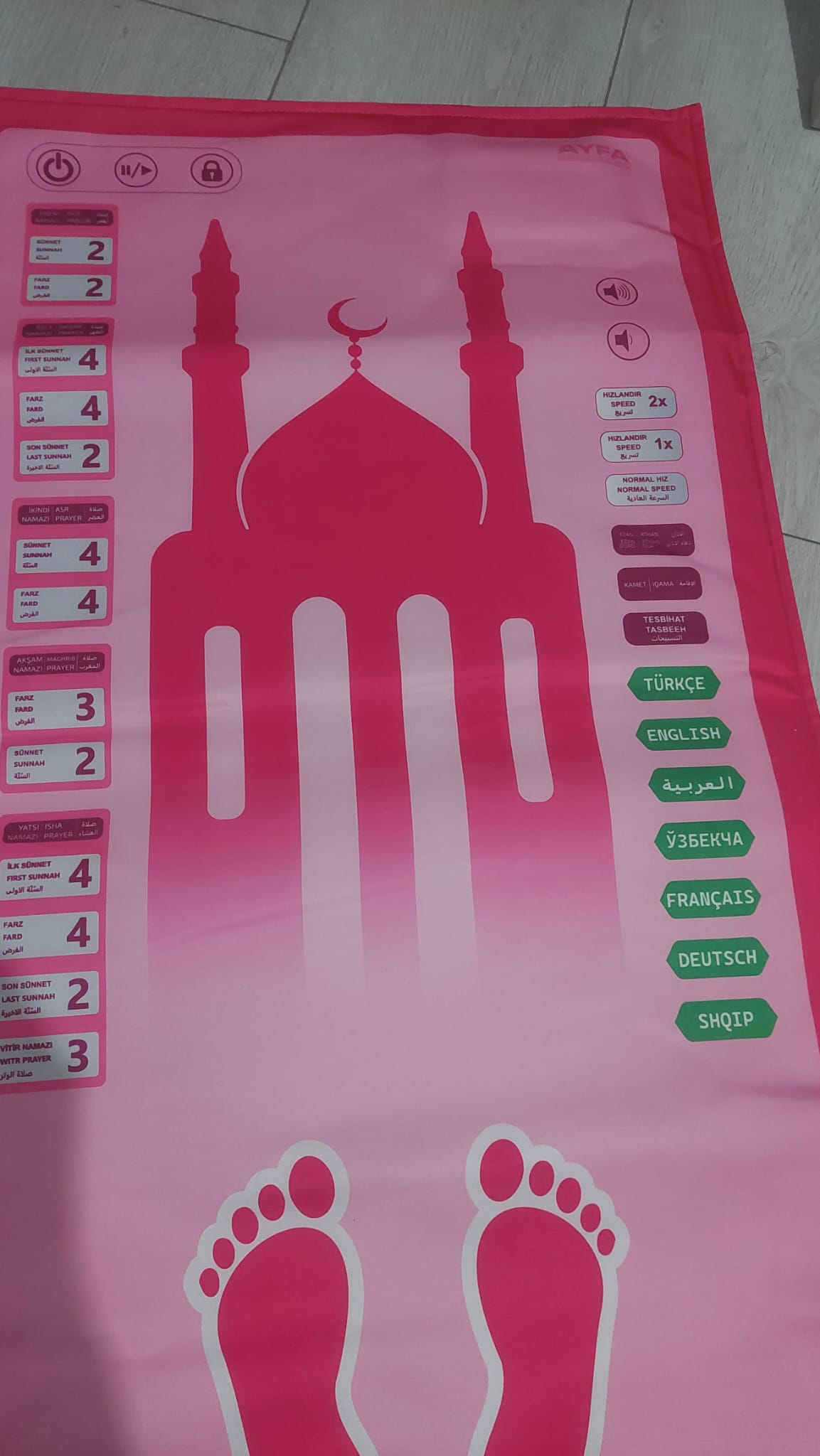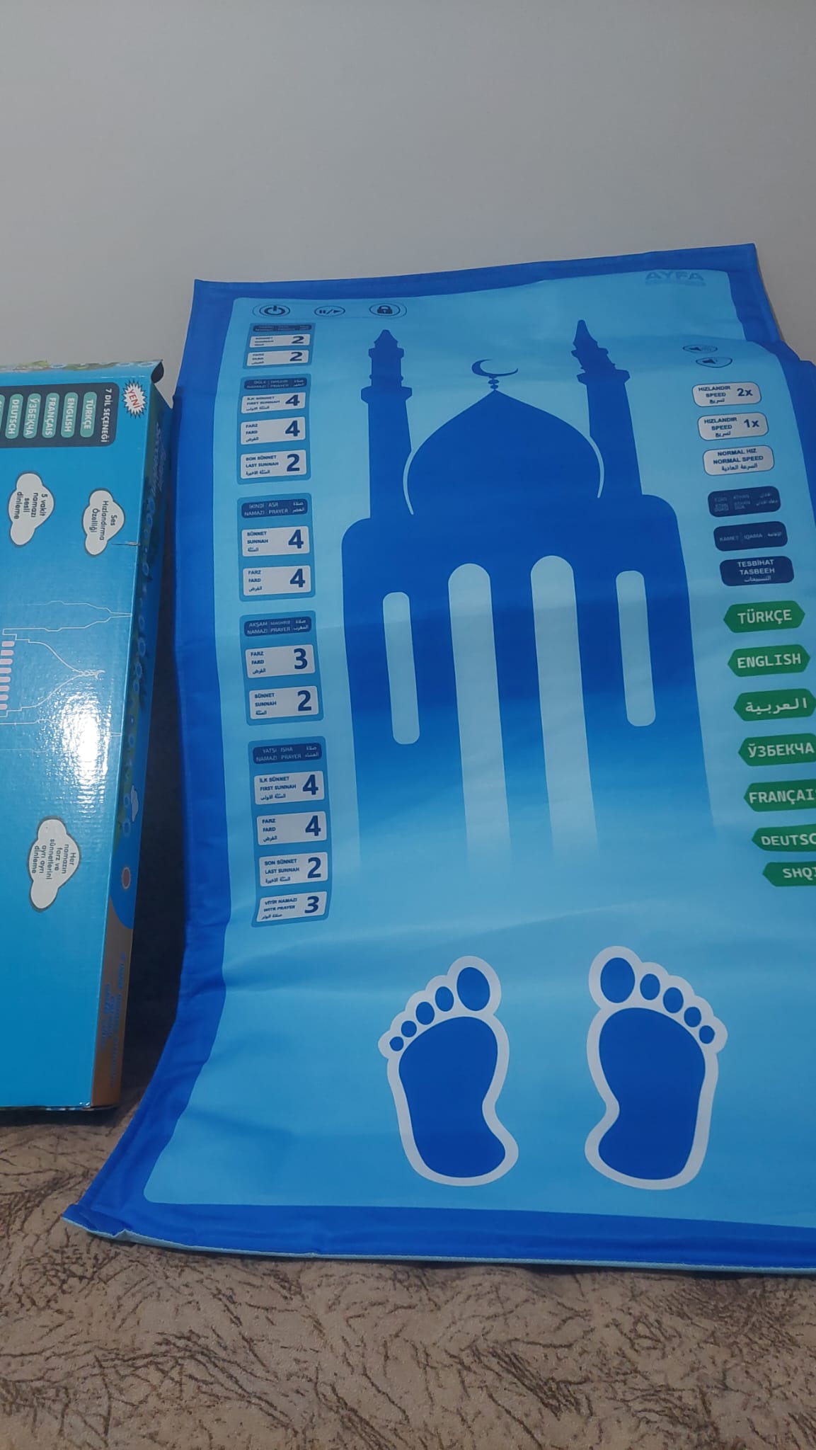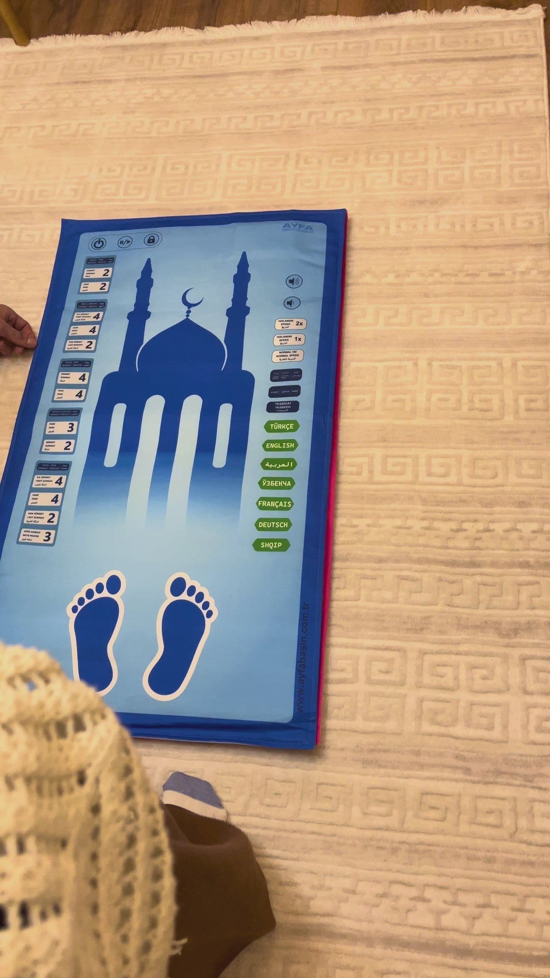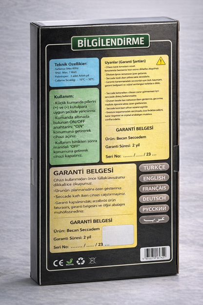 Ürün 3 adet pil ile çalışır. Piller takıldıktan sonra üzerindeki açma tuşuna basarak seccadeyi aktif hâle getirin.